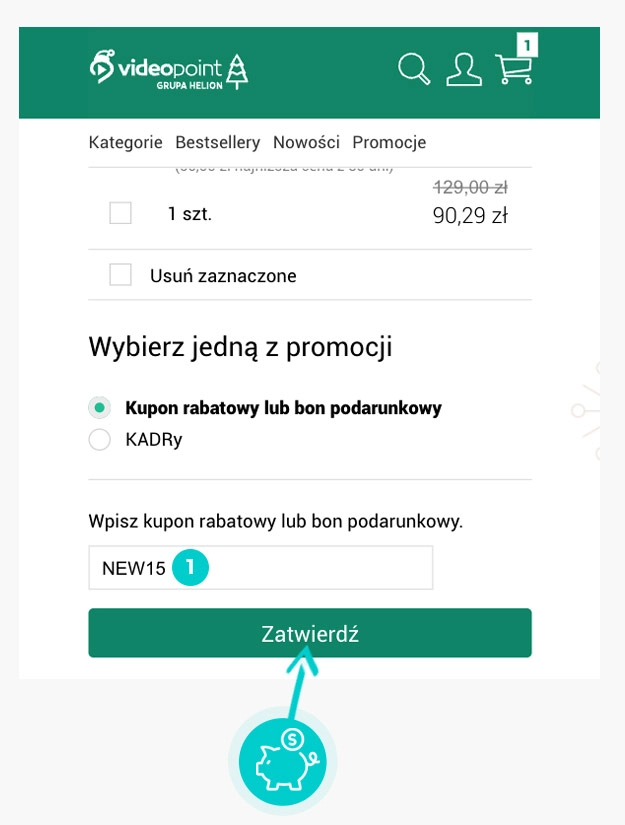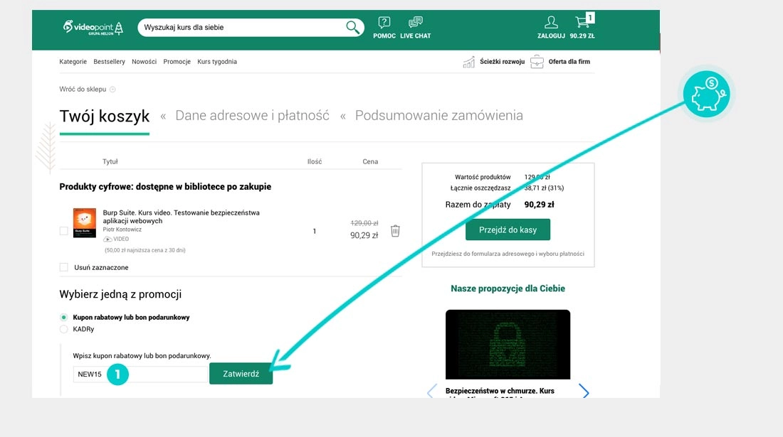 Wybierzcie w e-sklepie Videopoint.pl produkt, który was interesuje, naciśnijcie przycisk "Dodaj do koszyka", a produkt automatycznie zostanie dodany do waszego koszyka z zamówieniem. Po prawej stronie, w sekcji "Twój koszyk" znajdziecie pole "Kupon rabatowy lub bon podarunkowy". Tutaj wklejcie skopiowany kod rabatowy bądź wprowadźcie go ręcznie, i zatwierdźcie przyciskiem obok, a następnie zaznaczcie "Przejdź do kasy".