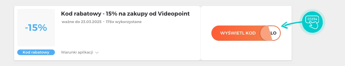 Wybierzcie na naszej stronie konkretny kod rabatowy, którego chcecie użyć w serwisie Videopoint.pl. Następnie kliknijcie pomarańczowy przycisk "Wyświetl kod".