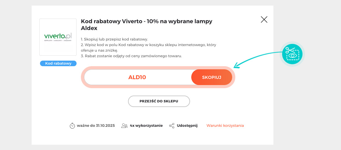 Skopiuj lub zapisz kod rabatowy, a następnie kliknij przycisk "Przejdź do sklepu". Zostaniesz automatycznie przekierowany do sklepu internetowego Viverto.pl.
