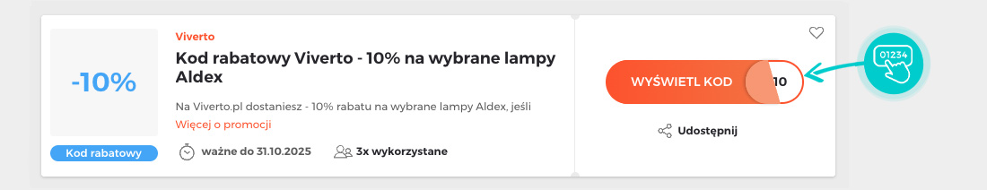 Wybierz na naszej stronie konkretny kod rabatowy, którego chcesz użyć w sklepie internetowym Viverto.pl. Następnie kliknij pomarańczowy przycisk "Wyświetl kod".