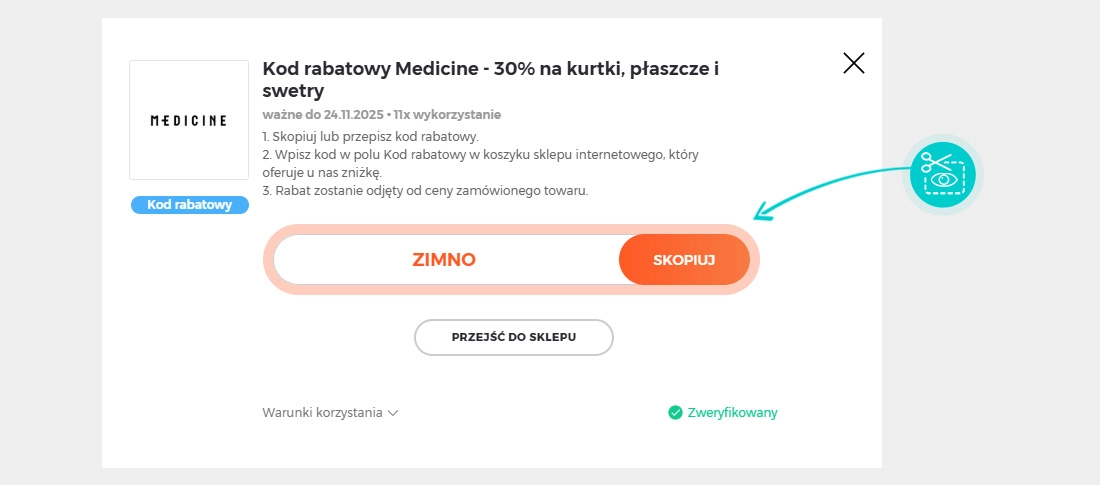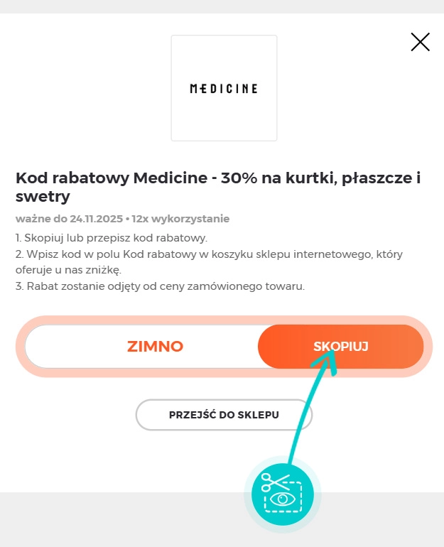 Skopiuj lub zapisz kod rabatowy i kliknij przycisk "Przejdź do sklepu". Nastąpi przekierowanie bezpieśrednio do sklepu internetowego Wearmedicine.com.