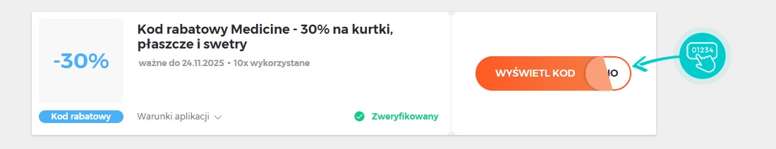 Wybierz na naszej stronie określony kod rabatowy, który chcesz zastosować w sklepie internetowym Wearmedicine.com. Kliknij pomarańczowy przycisk „Wyświetl kod”.