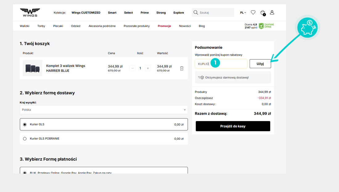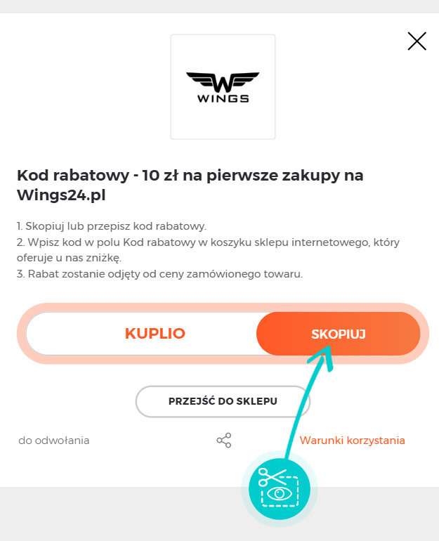 Skopiuj lub zapisz kod rabatowy i kliknij przycisk "Przejdź do sklepu". Nastąpi przekierowanie bezpieśrednio do sklepu internetowego Wings24.pl.