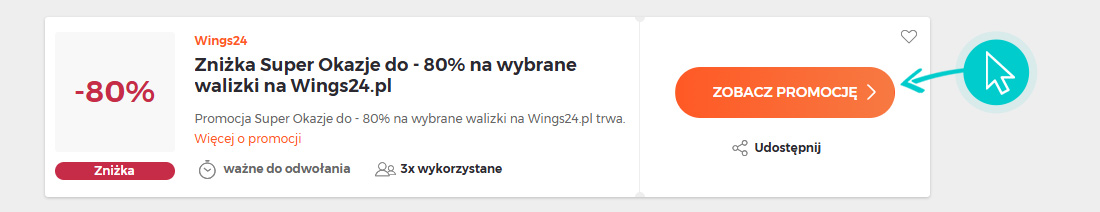 Wybierz konkretny rabat Wings24 na naszej stronie i kliknij przycisk "Zobacz promocje". Zostaniesz automatycznie przekierowany bezpośrednio do oferty specjalnej w sklepie internetowym Wings24.pl, w którym możesz kupić produkt ze zniżką.