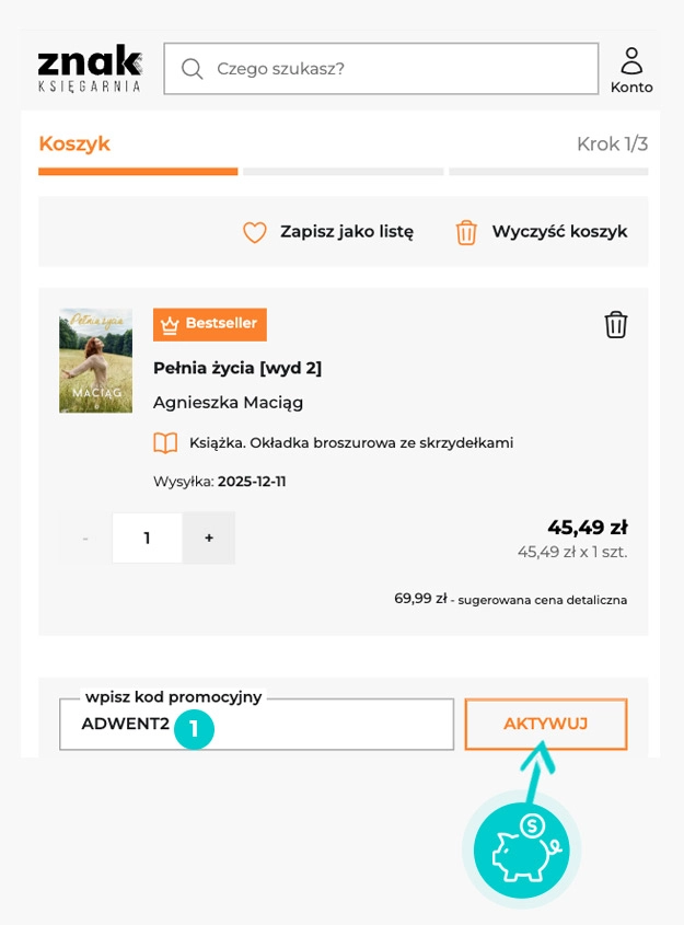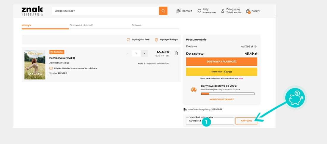 Wybierz produkt w e-sklepie znak.com.pl który Cię interesuje, naciśnij przycisk "Kup", a produkt zostanie automatycznie dodany do koszyka. Bezpośrednio w koszyku znajdziesz pole „Kupon podarunkowy lub rabatowy” pod wybranym produktem. Wpisz tutaj skopiowany kod rabatowy lub wprowadź go ręcznie i potwierdź przyciskiem „Zastosuj”.