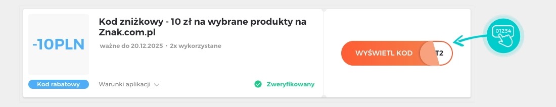 Wybierz na naszej stronie określony kod rabatowy, który chcesz zastosować w sklepie internetowym znak.com.pl. Kliknij pomarańczowy przycisk „Wyświetl kod”.
