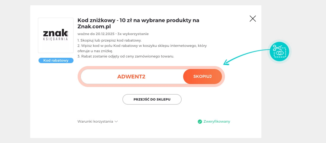 Skopiuj lub zapisz kod rabatowy i kliknij przycisk "Przejdź do sklepu". Nastąpi przekierowanie bezpieśrednio do sklepu internetowego znak.com.pl.