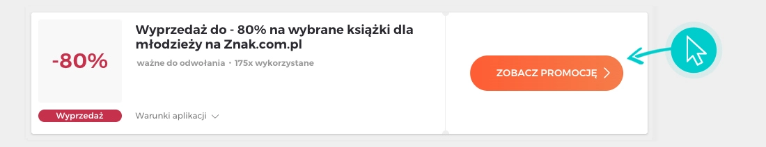 Wybierz konkretny rabat Znak na naszej stronie i kliknij przycisk "Zobacz promocje". Zostaniesz automatycznie przekierowany bezpośrednio do oferty specjalnej w sklepie internetowym znak.com.pl, w którym możesz kupić produkt ze zniżką.